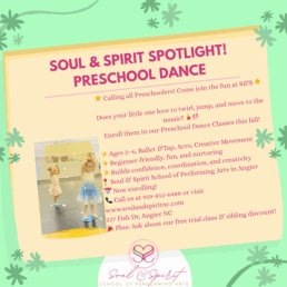 Our Preschool Dance Program at Soul & Spirit School of Performing Arts is a joyful introduction to dance, designed especially for young children. Through creative movement, basic ballet, and playful activities, dancers build coordination, rhythm, balance, and confidence — all while having fun!